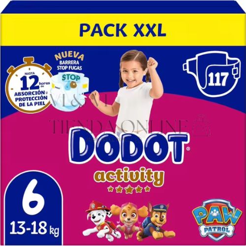 Con la súper caja de Dodot Activity Talla 6 (13-18 kg) tienes asegurada una protección de alto rendimiento para los peques más movidos. Esta caja ahorro de 117 pañales es ideal para padres que prefieren comprar en cantidad y olvidarse durante un buen tiempo de reponer.