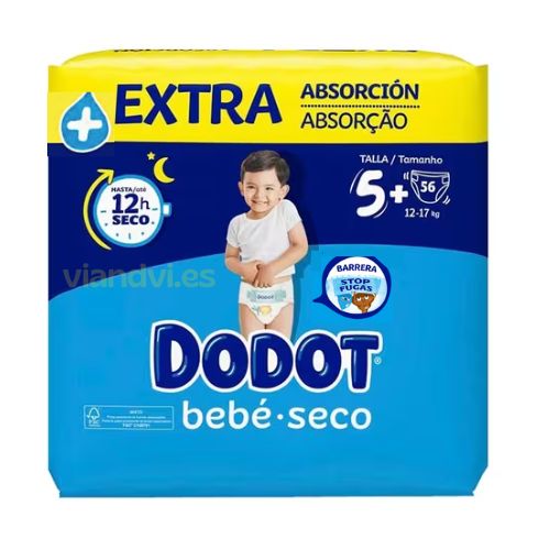 Dodot Bebé Seco Talla 5+ (12-17kg) Extra Absorción Pack 56 Pañales: Protección superior para tu bebé en crecimiento