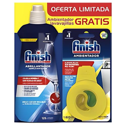 Consigue platos y vasos impecables con el abrillantador Finish, diseñado para eliminar marcas de agua y dejar un brillo perfecto en toda tu vajilla. Este pack incluye un Finish Abrillantador 500ml, ideal para lavavajillas automáticos, junto con un Ambientador Lima y Limón Gratis para mantener tu electrodoméstico fresco y libre de olores.