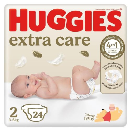 Los pañales Huggies talla 2 están pensados para ofrecer la máxima comodidad y protección a los bebés que comienzan a crecer y moverse más. Este pack de 24 unidades Huggies Extra Care Talla 2 (3-6 kg) combina suavidad, absorción y ajuste perfecto para cuidar la piel del bebé en todo momento.