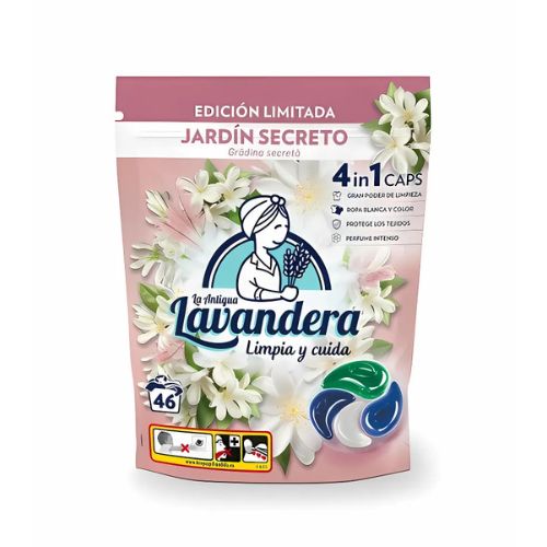 La Antigua Lavandera Jardín Secreto es el detergente en cápsulas ideal para quienes buscan una colada impecable con un perfume floral duradero. Su innovadora fórmula encapsula toda la potencia de limpieza en un formato monodosis cómodo y eficaz, diseñado para eliminar la suciedad más difícil sin dañar los tejidos. Gracias a su tecnología avanzada, actúa en profundidad para mantener la ropa limpia, fresca y con un aroma irresistible.