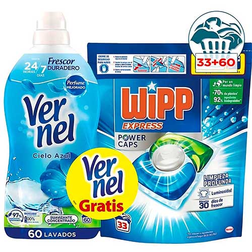Pack ahorro con 33 cápsulas de detergente Wipp Express Limpieza Profunda y suavizante Vernel 60 lavados. Ropa limpia, fresca y suave en cada colada.